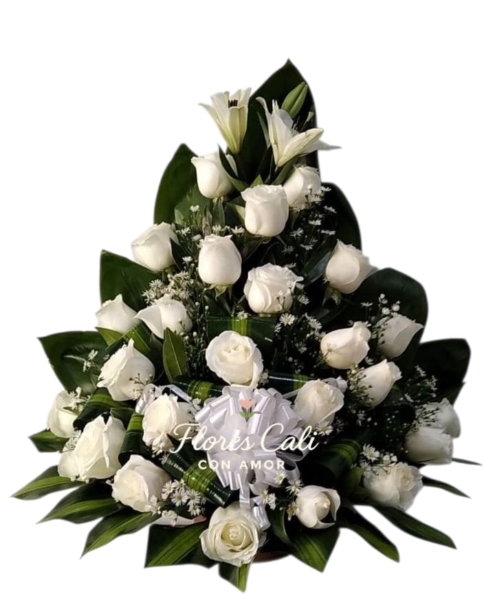 El color blanco simboliza la luz y la eternidad, mientras que los lirios representan la esperanza y la renovación espiritual. Cada flor ha sido cuidadosamente seleccionada y dispuesta sobre un fondo de follaje verde natural, creando un diseño armonioso y respetuoso.