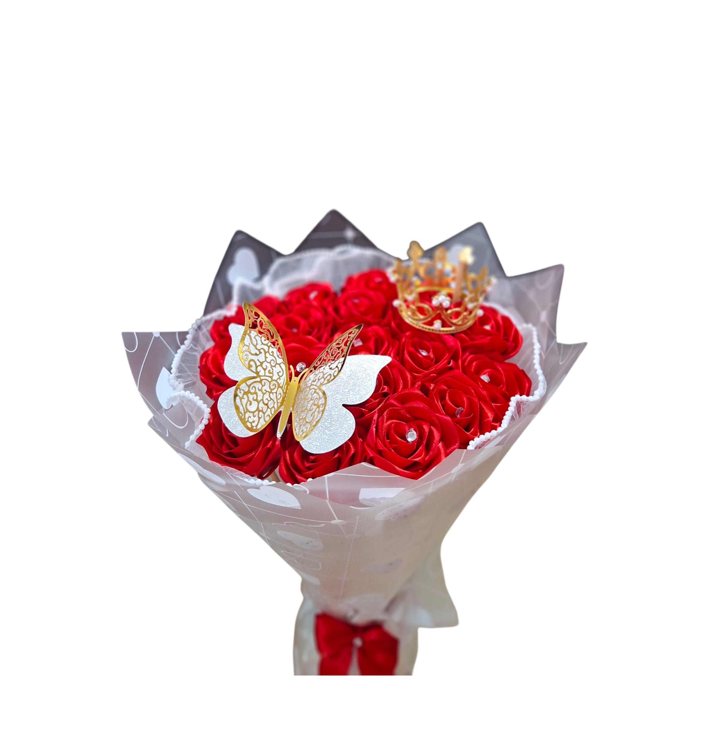 Hermoso arreglo decorativo elaborado con rosas rojas de tela de alta calidad, diseñado para transmitir amor, elegancia y romanticismo. Incluye delicados detalles como una corona decorativa dorada y una mariposa ornamental que aportan un toque sofisticado y único.