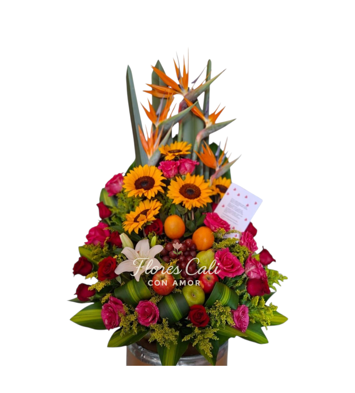 Este hermoso arreglo floral con frutas destaca por la alegría de los girasoles, la elegancia de las rosas rojas y rosadas, y la fuerza exótica de las aves del paraíso. Se complementa con delicadas flores blancas, follajes verdes y una selección de frutas frescas como manzanas, peras, uvas y cítricos, que aportan un toque de abundancia y frescura.