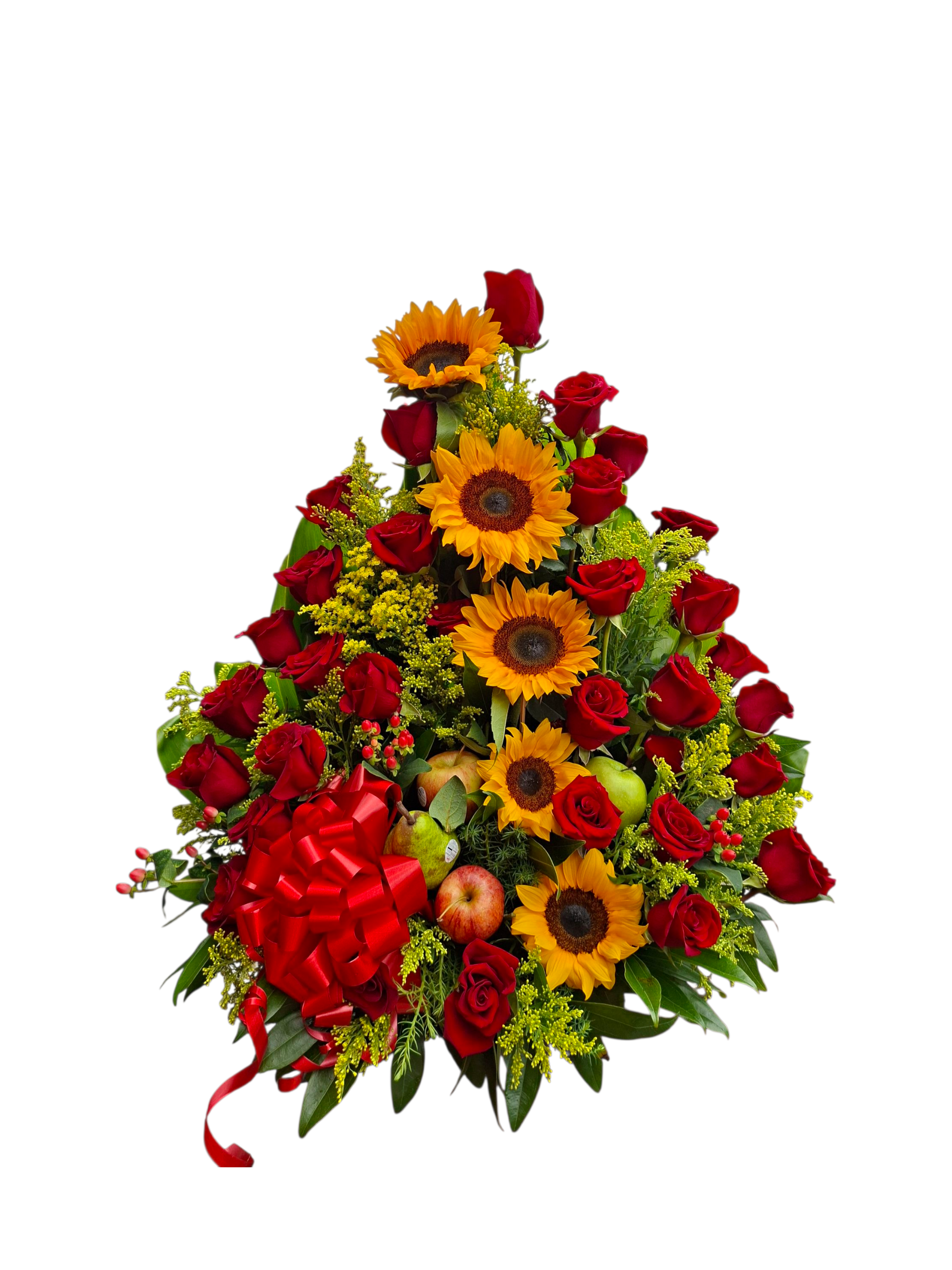 Este impactante arreglo floral combina la energía y alegría de los girasoles con la elegancia y pasión de las rosas rojas, complementado con follajes verdes y una selección de frutas frescas que aportan un toque de abundancia y distinción. Su diseño armonioso y colorido lo convierte en una opción ideal para cumpleaños, aniversarios, celebraciones especiales, agradecimientos o para sorprender con un detalle lleno de vida y buenos deseos.
