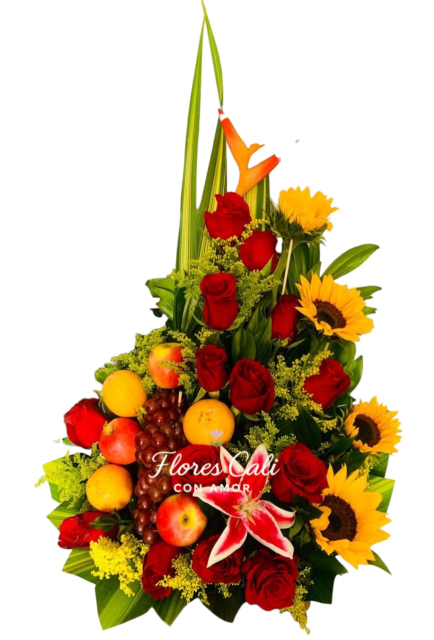 Un detalle lleno de vida, color y frescura. Este elegante arreglo floral con frutas combina la belleza de las rosas rojas, la alegría de los girasoles, la sofisticación del lirio y el exotismo de la ave del paraíso. Todo acompañado de una selección de frutas frescas como uvas, manzanas y naranjas, perfecto para regalar en cualquier ocasión especial.