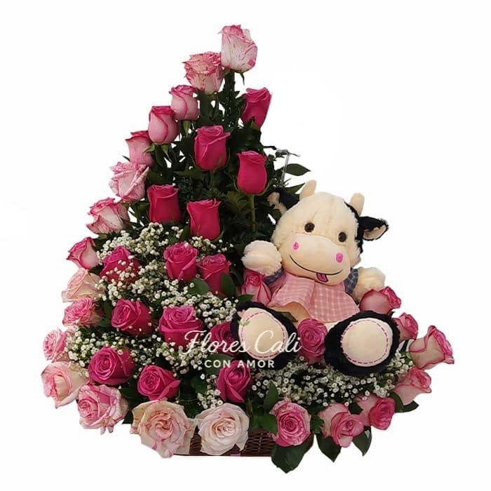 Sorprende a esa persona especial con este encantador arreglo floral de rosas rosadas y fucsias acompañado de un adorable peluche de vaquita. Perfecto para expresar cariño, amor y ternura en cualquier ocasión especial.