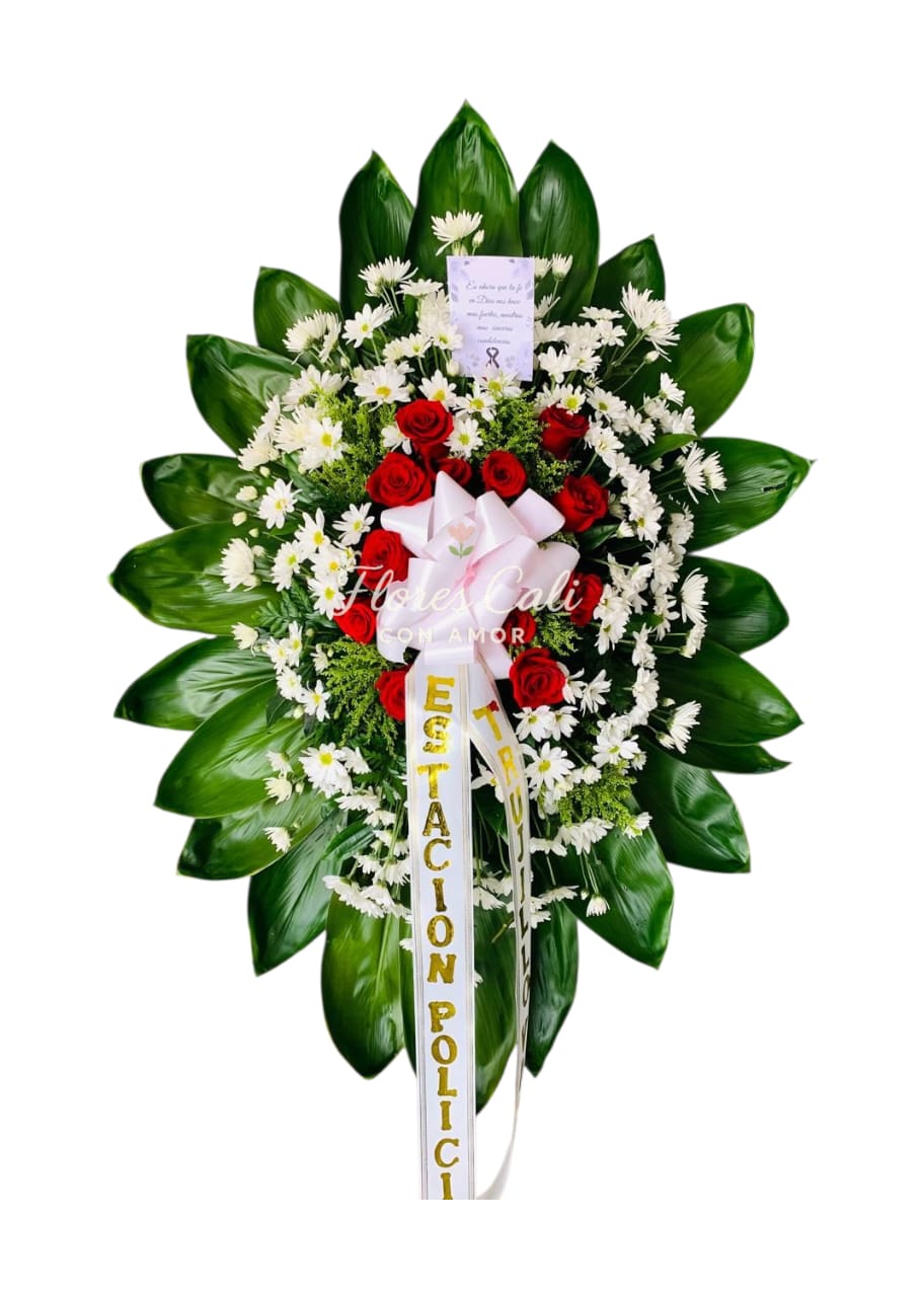 Esta corona fúnebre con rosas rojas y margaritas blancas es un símbolo de amor eterno, respeto y fortaleza. Elaborada con flores naturales de la mejor calidad, combina la pureza del blanco con la intensidad del rojo, creando un arreglo floral elegante y significativo para despedir a un ser querido.