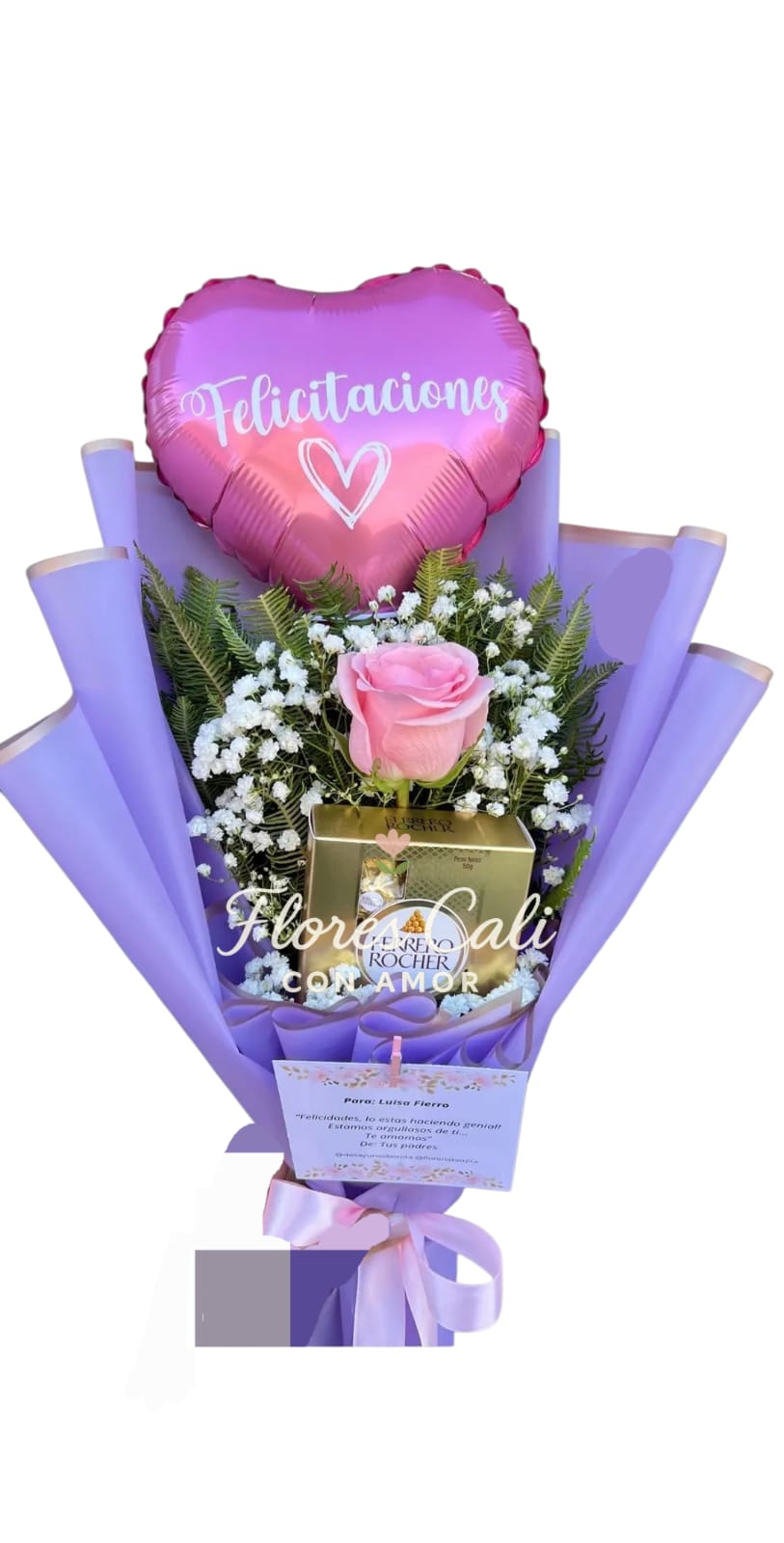 Celebra los logros de esa persona especial con nuestro ramo de felicitación exclusivo de Flores Cali Con Amor. Este hermoso arreglo está compuesto por una rosa rosada, follaje fresco, delicadas flores perla, y un toque especial con una caja de chocolates Ferrero Rocher.