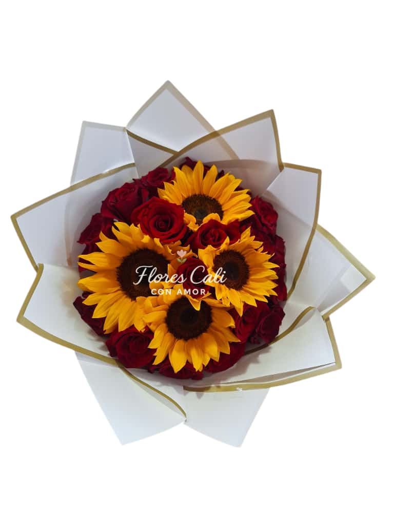 Este elegante Bouquet de girasoles con rosas rojas es la fusión perfecta entre energía, amor y elegancia. Los girasoles representan la alegría y la vitalidad, mientras que las rosas rojas simbolizan el amor profundo y la pasión.