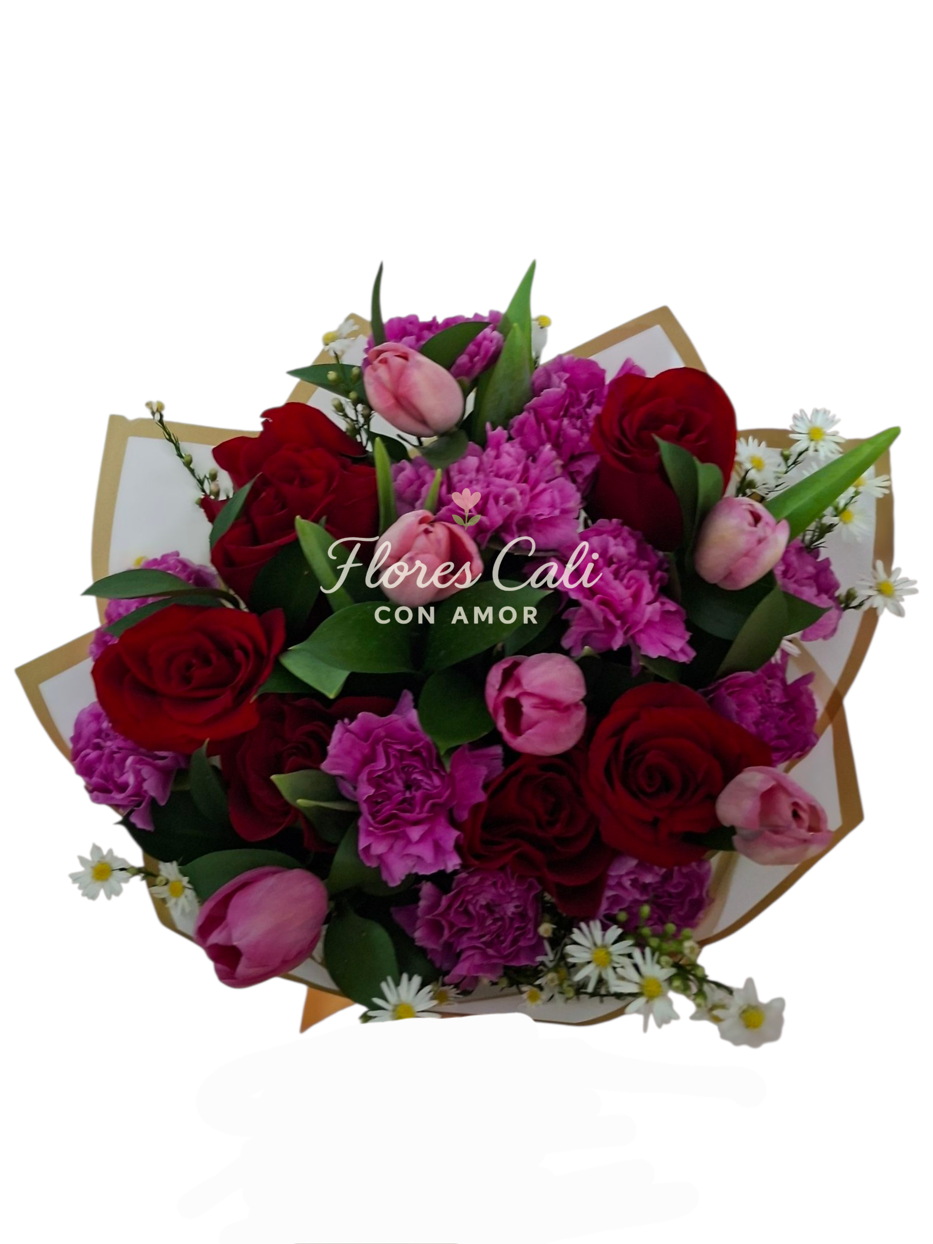 Las rosas rojas simbolizan la pasión, mientras que los tulipanes rosados aportan dulzura y cariño. Se complementa con flores adicionales en tonos fucsia y pequeños detalles blancos que le dan frescura y un toque natural, junto con follaje verde que realza toda la composición.