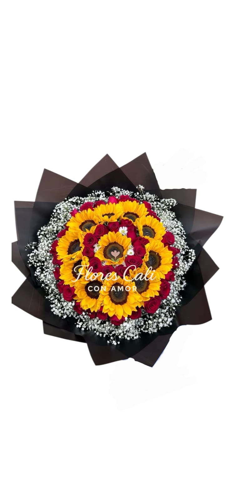 Buchón de girasoles y rosas rojas, decorado con delicadas flores blancas de relleno perla, es una obra maestra floral diseñada para impresionar. Su forma circular representa eternidad y armonía, mientras que sus colores transmiten alegría, amor y pureza.