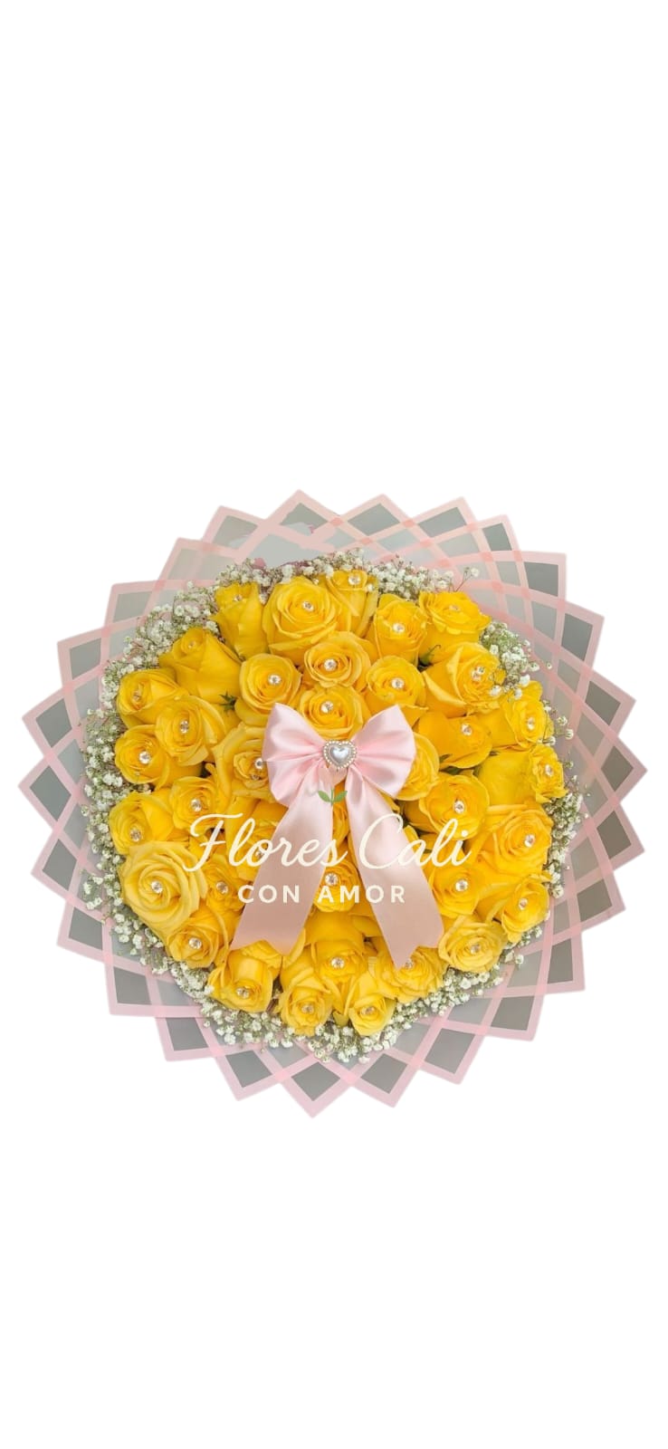 Buchón de rosas amarillas con detalles de perlas y un lazo rosa con corazón es un regalo lleno de dulzura y elegancia. Ideal para transmitir cariño sincero, admiración o agradecimiento.