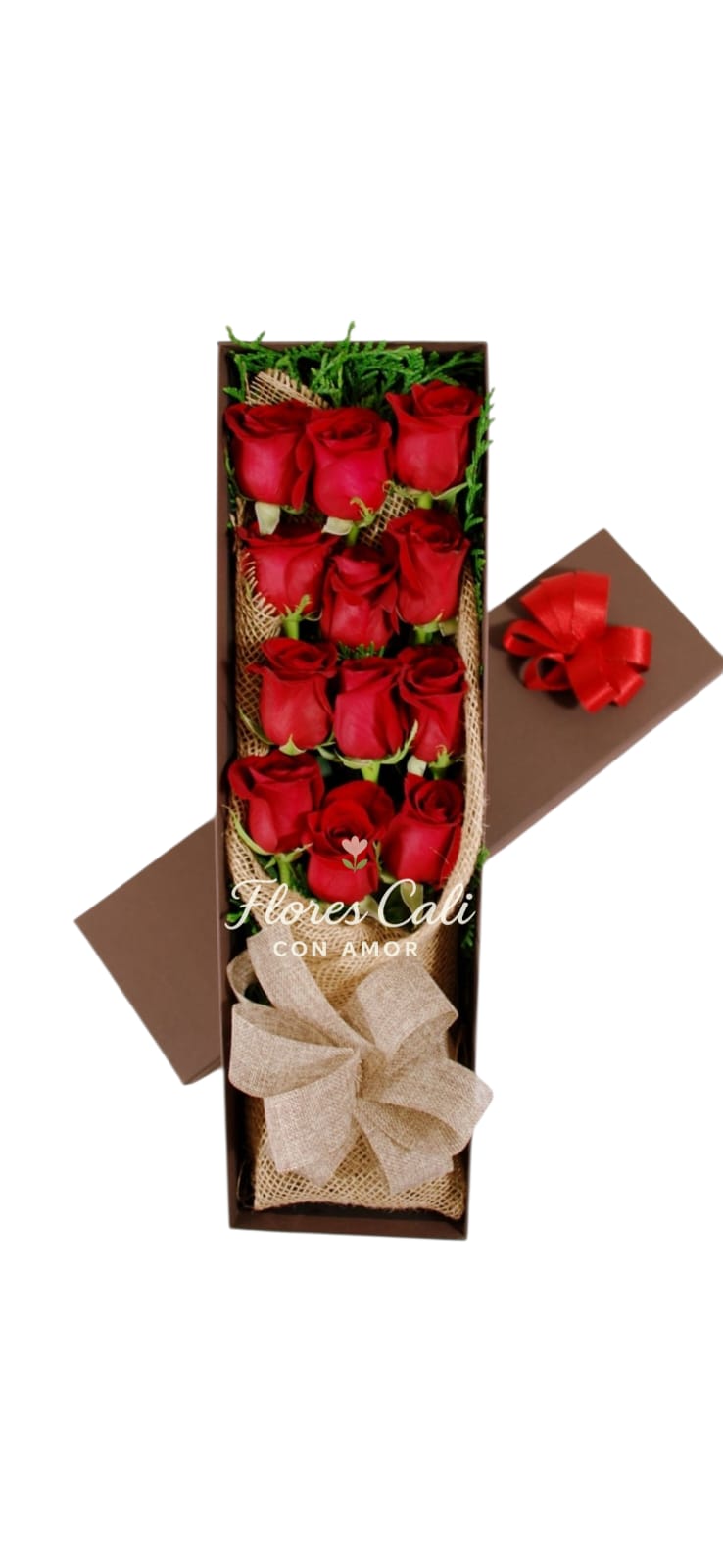Sorprende con esta caja de rosas rojas, una presentación clásica que nunca pasa de moda. Perfecta para expresar amor profundo, gratitud o admiración, esta elegante caja incluye una cuidada selección de 12 rosas frescas, follaje natural y un moño decorativo en tela yute que le da un toque rústico y especial.