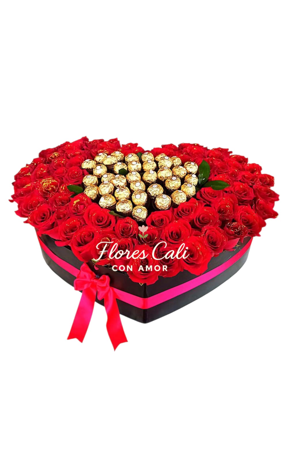 Haz que tu regalo sea inolvidable con esta espectacular caja en forma de corazón, diseñada especialmente para expresar amor, pasión y dulzura. Este elegante arreglo floral incluye docenas de rosas rojas frescas dispuestas cuidadosamente alrededor de deliciosos chocolates Ferrero Rocher, creando una combinación perfecta entre belleza y sabor.