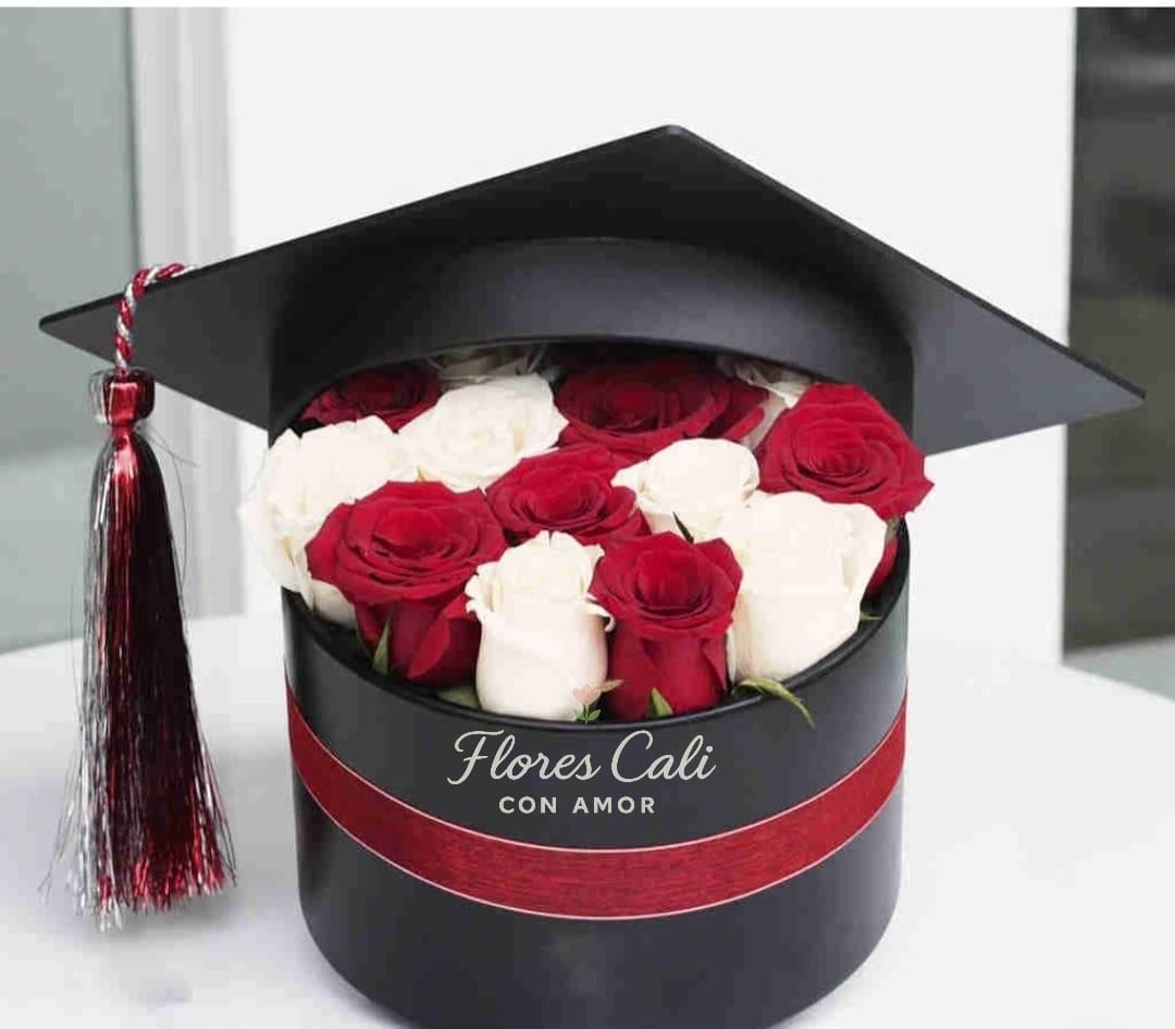 Celebra un logro inolvidable con nuestra elegante Cilindro de rosas para graduación, un detalle exclusivo de Flores Cali Con Amor. Este diseño premium incluye una combinación perfecta de rosas rojas y blancas frescas, presentadas en una caja cilíndrica negra decorada con una cinta roja que aporta sofisticación y estilo.