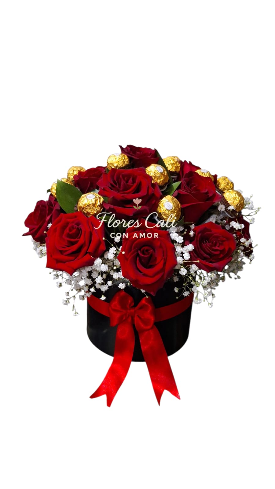 Un detalle que enamora: este elegante arreglo combina la pasión de las rosas rojas con la dulzura de los chocolates Ferrero Rocher, todo presentado en una sofisticada caja tipo sombrerera con lazo rojo. Perfecto para cumpleaños, aniversarios, San Valentín o simplemente para decir “te quiero” con estilo y sabor.