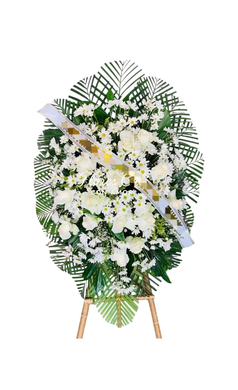 Este arreglo floral fúnebre es perfecto para despedir con serenidad y gratitud a un ser querido, transmitiendo un mensaje de respeto y acompañamiento. Su diseño elegante, elaborado con follaje fresco y flores cuidadosamente seleccionadas, garantiza armonía y belleza en cada detalle.