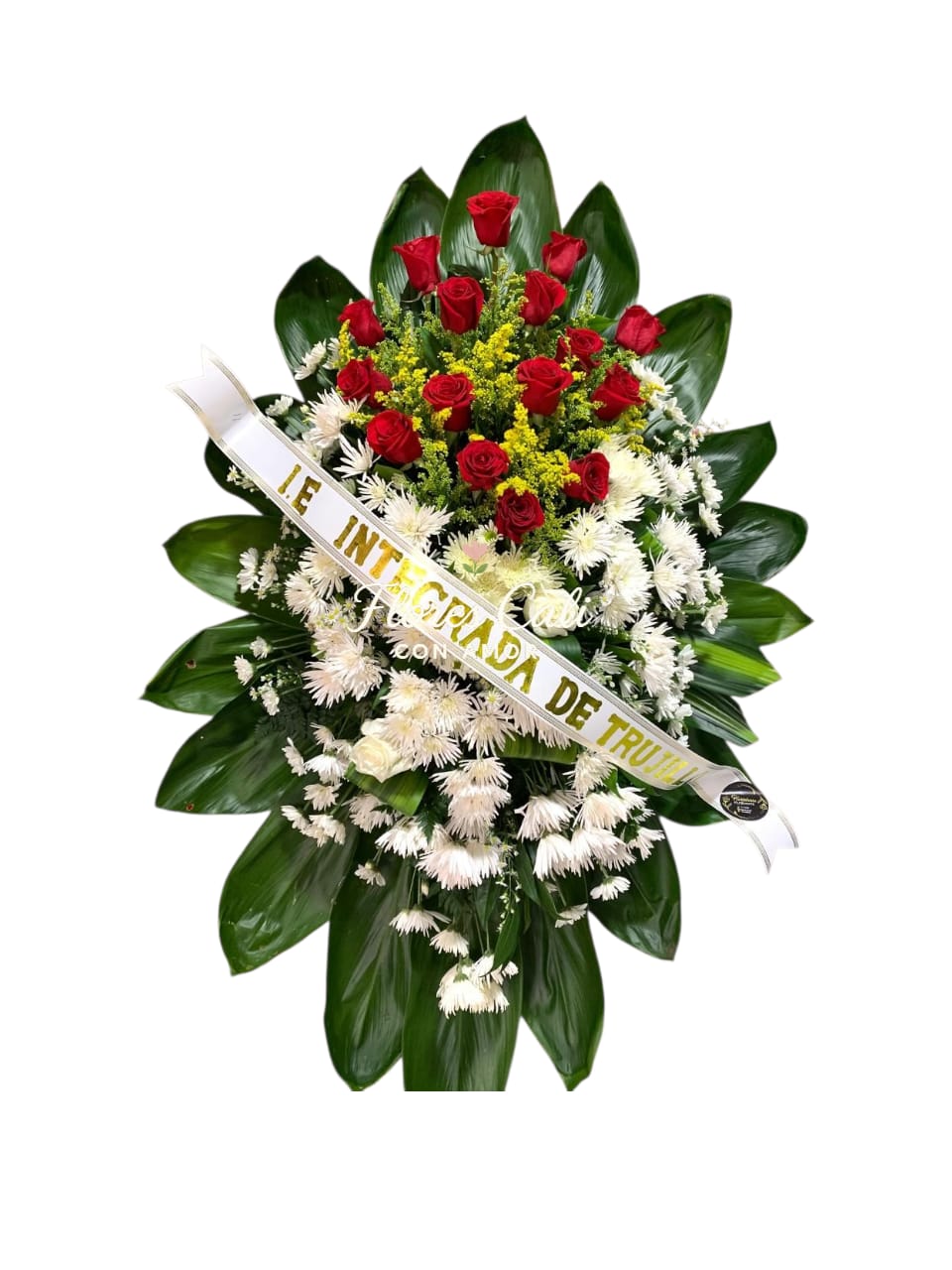 Las rosas rojas representan el cariño profundo, la admiración y los recuerdos que perduran en el corazón, mientras que las Crisantemo blancas reflejan pureza, inocencia y serenidad. Este arreglo floral fúnebre es una muestra perfecta de afecto hacia familiares, amigos o colegas que atraviesan la pérdida de un ser querido.