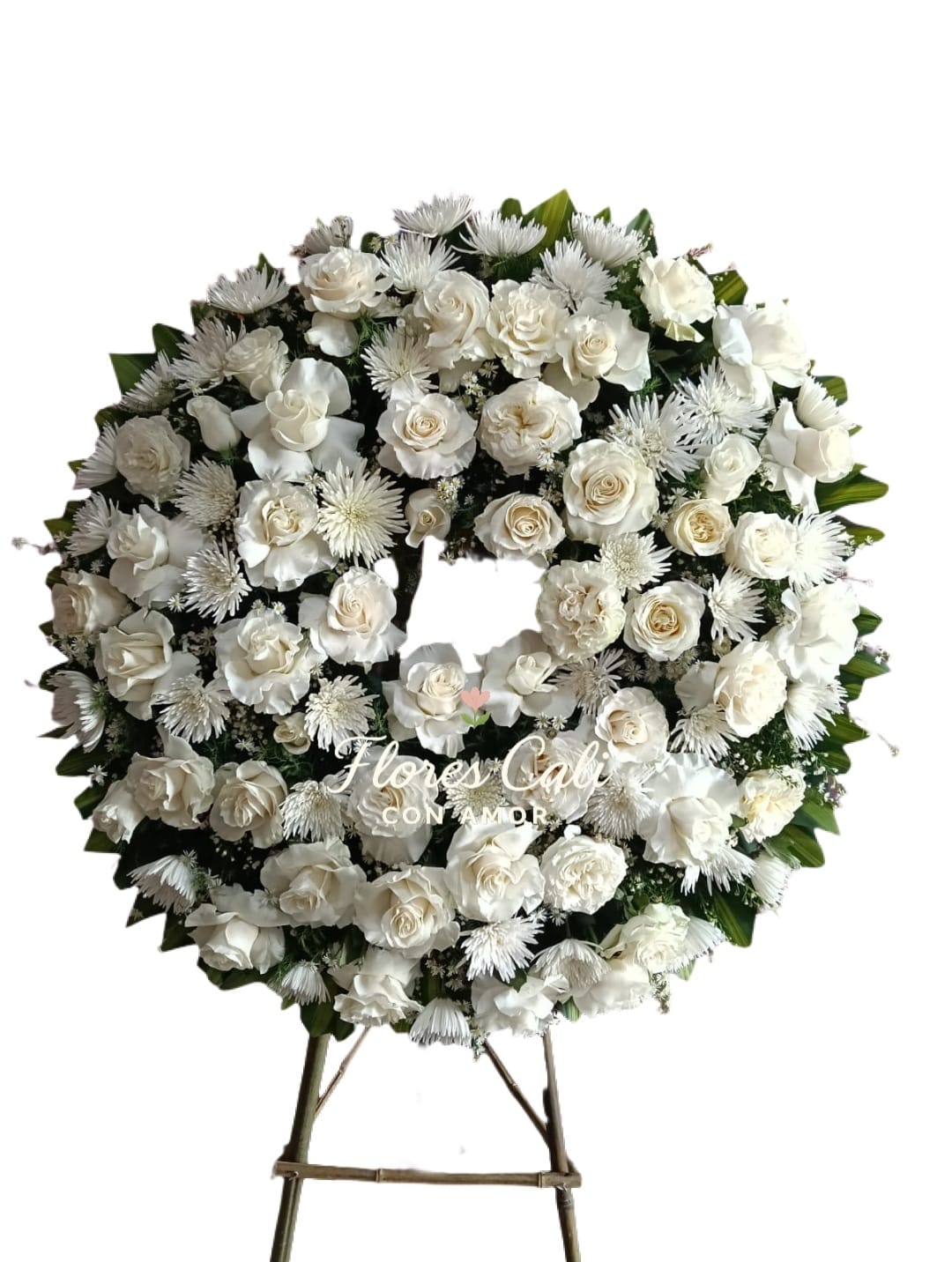 El blanco, color central de esta composición, simboliza la luz, la eternidad y la paz espiritual, mientras que la forma circular de la corona representa el ciclo infinito de la vida y el amor eterno. Este arreglo es ideal para expresar condolencias sinceras y acompañar con respeto ceremonias religiosas o velaciones.