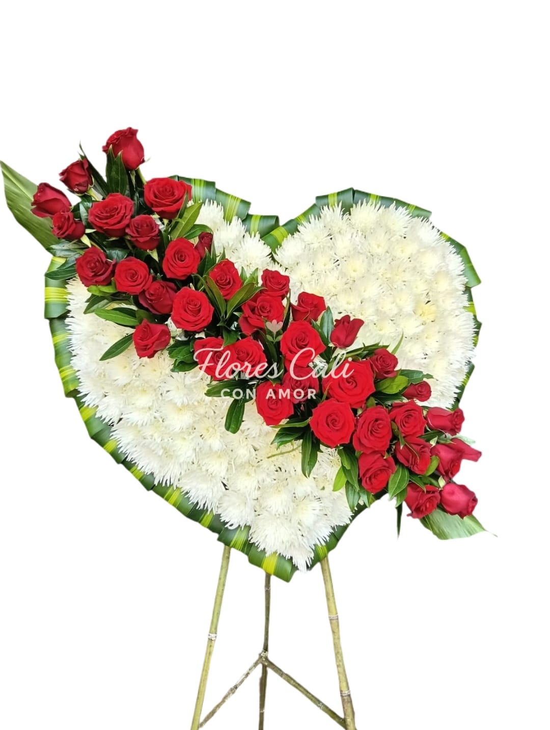 Las flores blancas, cuidadosamente dispuestas para formar un corazón perfecto, representan la paz, pureza y esperanza, mientras que las rosas rojas transmiten amor eterno, gratitud y profundo afecto hacia esa persona que deja una huella imborrable. La combinación de colores y texturas crea un equilibrio visual armonioso que evoca serenidad y consuelo.